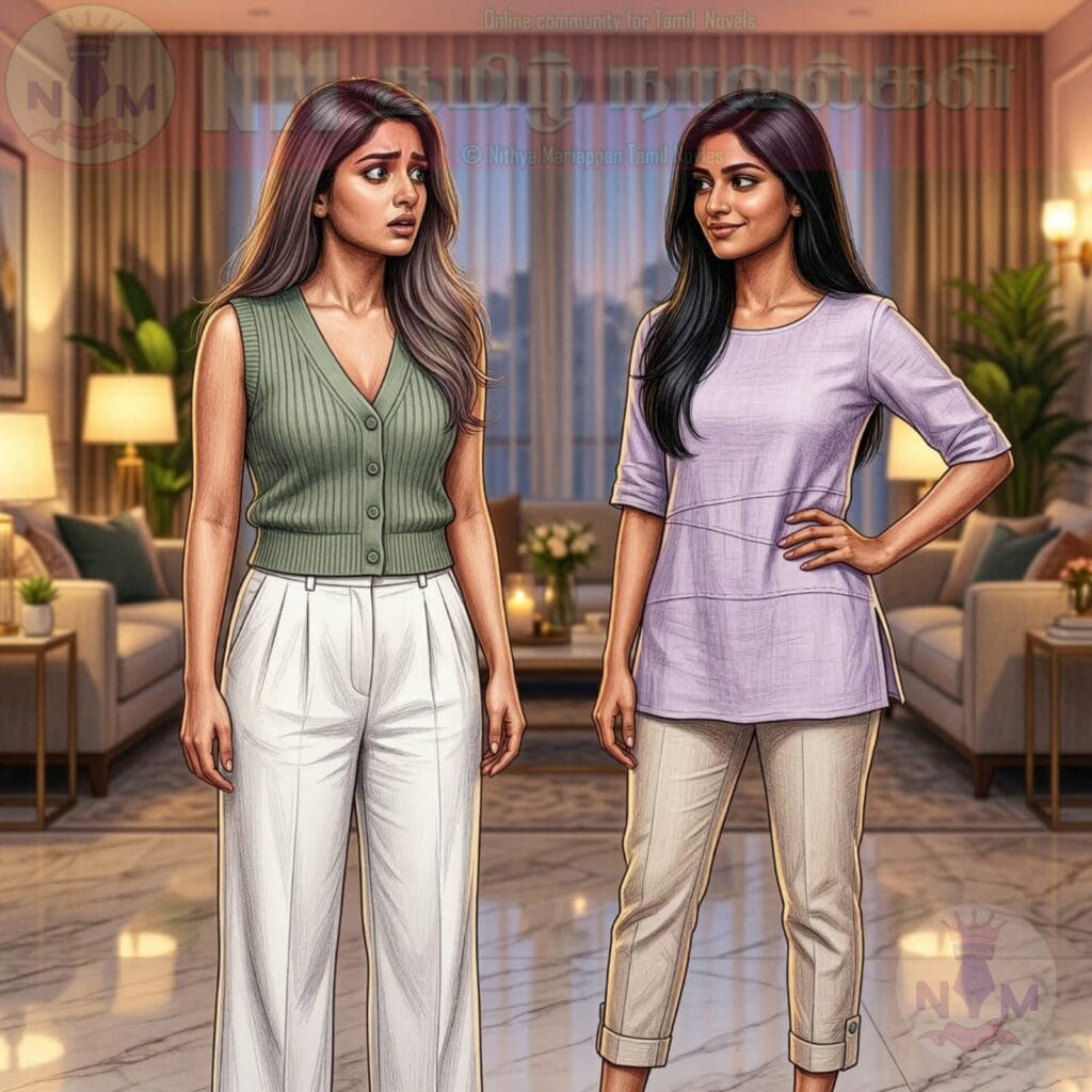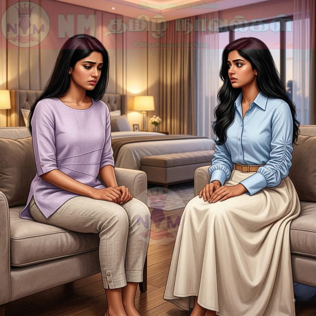 “நான் என்ன தப்பா சொல்லிட்டேன் நயனி? இவளால என் பிள்ளைக்குப் பெஸ்டான எஜூகேசனை குடுக்க முடியுமா? நல்ல லைஃப்ஸ்டைலை குடுக்க முடியுமா? இந்த மகாராணியே மாசச்சம்பளத்தை நம்பி வாழுறா… இதுல என் பிள்ளைய எப்பிடி நல்லபடியா வளர்ப்பா?”
