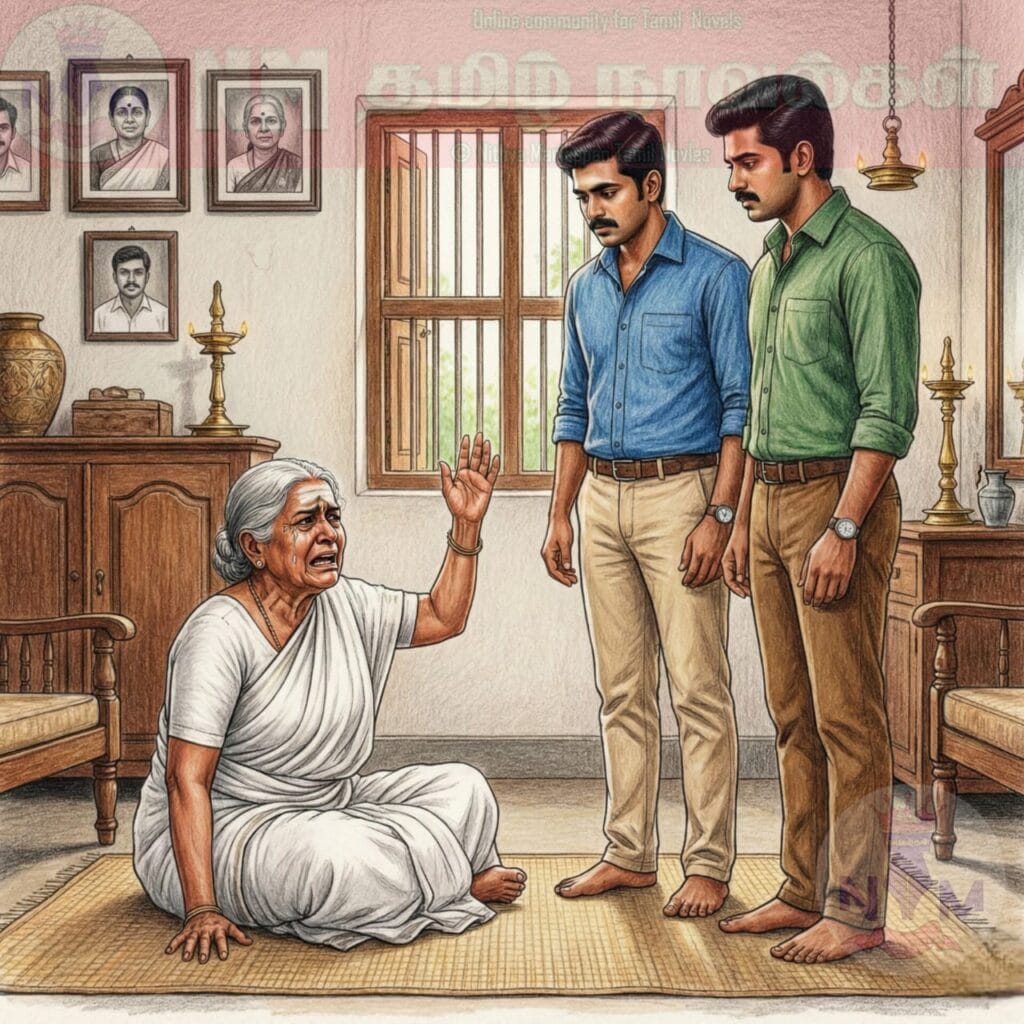 கலைந்திருந்த கூந்தலைக் கொண்டை போட்டுக்கொண்டவர், “உங்க நாலு பேரையும் கெஞ்சிக் கேக்கிறேன், உங்க பவுசைக் காட்டுறதுக்கு என் பிள்ளையைப் பலி குடுத்துடாதிங்க” என்று இரு மகன்களையும் கணவர் மற்றும் தமையனையும் கையெடுத்துக் கும்பிட்டுவிட்டு கதறியழத் தொடங்கினார்.