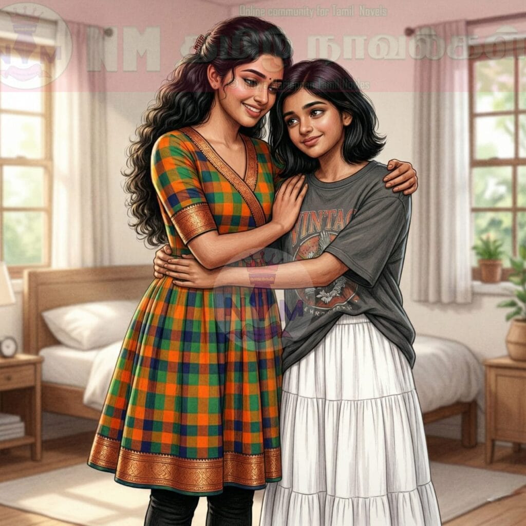 சந்தோஷத்துடன் தங்கையை அணைத்துக் கொண்டவள், “ஒன்னும் இல்ல நீரு. என் குட்டித் தங்கச்சிம்மா இன்னைக்குப் பெரிய பொண்ணா ஆயிட்டா. இது சந்தோஷமான விஷயம் தான். வா அக்கா உனக்குச் சொல்லிப் புரிய வைக்கிறேன்” என்று தங்கையைப் பாத்ரூமுக்கு அழைத்துச் சென்று அவளைக் குளிக்கச் சொன்னவள், அவளிடம் என்ன செய்ய வேண்டும் என்பதை ஓர் அக்காவாக மட்டுமின்றி அன்னையாக விளக்கிக் கூறிவிட்டு சீதாலெட்சுமியிடம் இந்தச் சந்தோஷமான தகவலைச் சொல்லச் சென்றாள்.