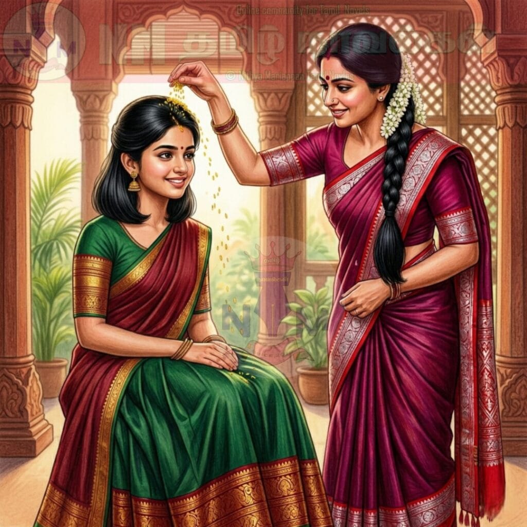 மாமியாரிடம் வந்தவர், “அம்மா! உங்க பேத்தி ருதுவாயிட்டாளாமே. நம்ம சாம்பு மாமாவை கூப்பிட்டுப் பதினாறாம் நாள் கிரகசுத்தி, புண்ணியாவாசனம் பண்ணிடுவோம். மத்த விஷயத்தை அவரண்ட நீங்களும் அப்பாவும் பேசிடுங்கோ” என்று தன்னுடைய சொந்த விருப்பு வெறுப்புகளை ஒதுக்கி வைத்துவிட்டு மூத்த மருமகளாகத் தனது கடமையைச் செய்ய விழைந்தார்.