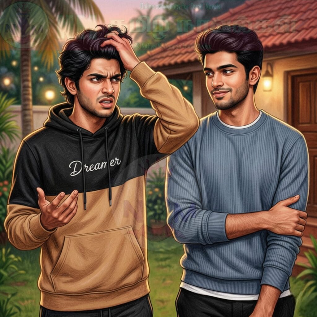 மைத்ரேயியும், நீரஜாட்சியும் அவள் படிக்காமல் இருப்பதற்கு இந்தப் படிப்பு எவ்வளவோ மேல் என்று சமாதானமாகிவிட, ‘இன்டர்நேஷனல் வேல்யூ’ என்ற வார்த்தையில் காண்டான பத்மாவதியும் ஸ்ருதிகீர்த்தியும் வீட்டிற்குள் சென்றுவிட்டனர். மைதிலி மூன்று பெண்களையும், மாமனார் மாமியாரையும் அழைத்துக் கொண்டு அவுட் ஹவுஸினுள் சென்றுவிட, அங்கே நடந்த அத்தனை கலவரங்களிலும் தங்களின் பெயர் அடிப்பட்ட அதிர்ச்சியில் நின்றனர் அண்ணனும், தம்பியும்.