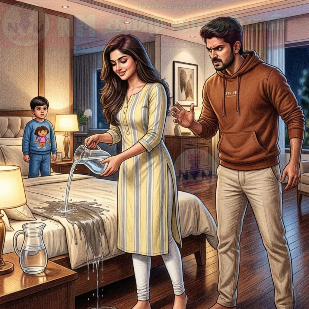 “முடியாது” என்றவன் ஏதோ மொபைல் அழைப்பு வரவும் ஒதுங்க நித்திலா குடிப்பதற்காக வைத்திருந்த தண்ணீரை அந்த பெட்டில் ஊற்றிவிட்டாள்.