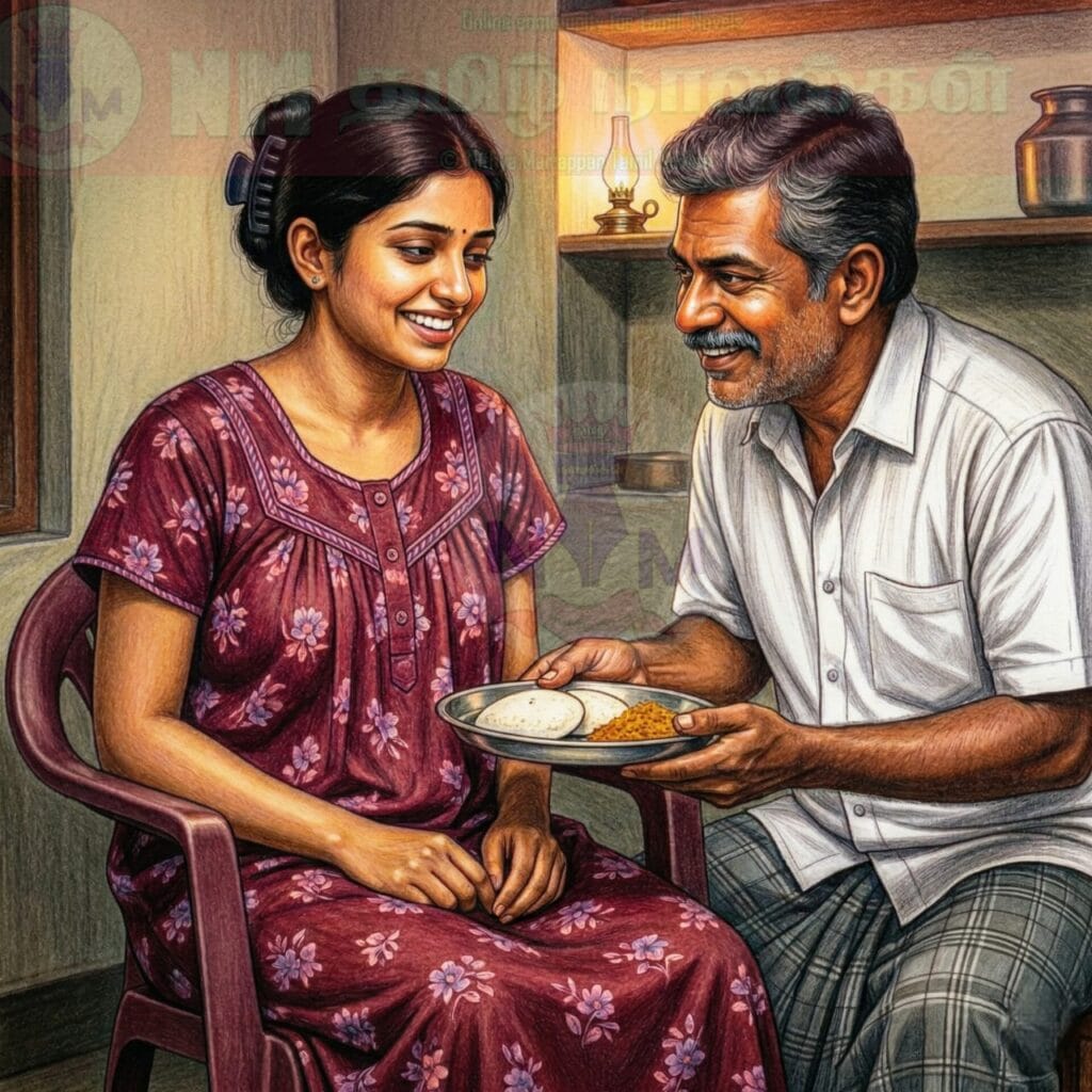 “இட்லிப்பொடி வச்சு சாப்பிடும்மா. உன் அத்தைக்குக் கர்ப்ப காலத்துல சாம்பார் சேரல. இப்பிடித்தான் வாந்தி எடுப்பா. உனக்கும் அப்பிடித்தான் போல. இந்தா பூண்டு போட்டு இடிச்ச இட்லிப்பொடி” என்று அன்போடு மருமகளிடம் சாப்பாடு தட்டை நீட்டினார் ரத்தினவேலு.
