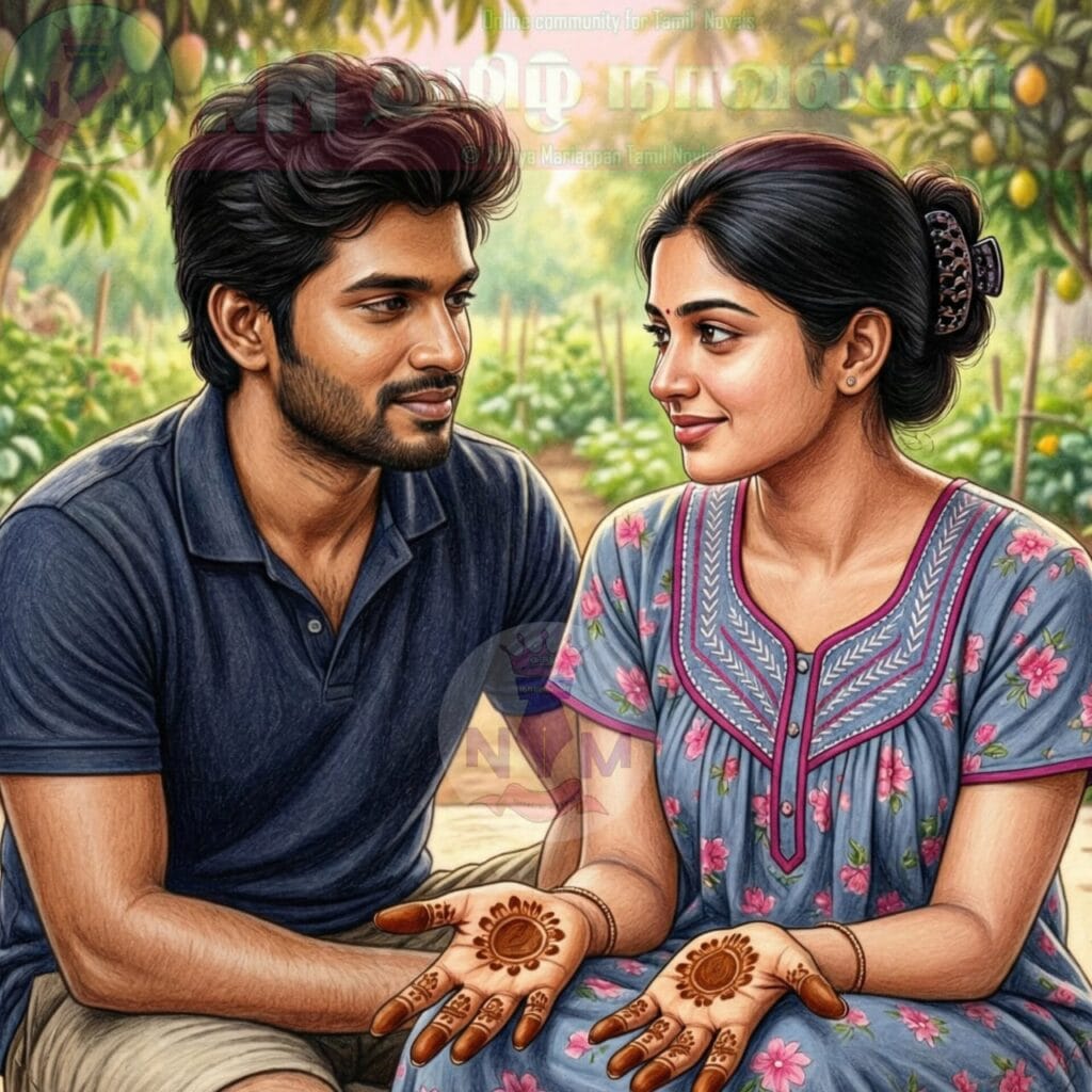 விரல்களில் ஒட்டியிருந்த மருதாணிக்கலவையை அவனது நாசியில் தேய்த்தபடி குறும்பாக வினவி அவனைச் சிரிக்க வைத்தாள் தேவயானி.