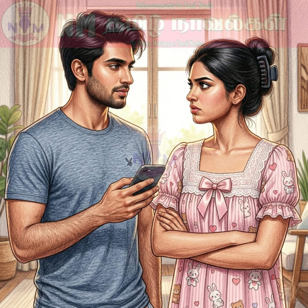 கடுப்போடு அவனிடமிருந்து மொபைலைப் பிடுங்கியவள், “என் மொபைலை எதுக்கு எடுத்துப் பாக்குற நீ?” என்று சீறினாள்.