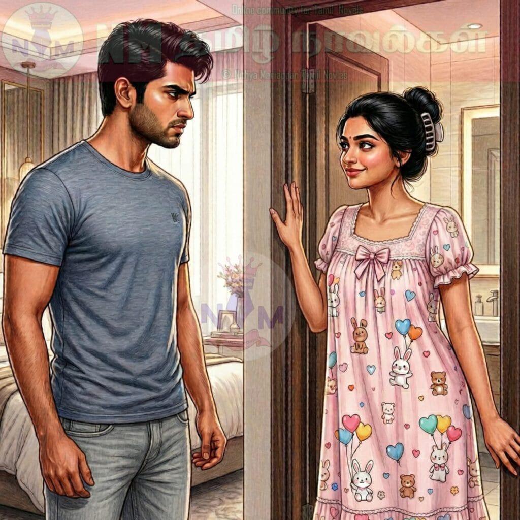 வானதி அவனைத் தள்ளிவிட்டு குளியலறை நிலையில் கை வைத்து மறித்தவள், “அவ்ளோ அவசரப்படுறவன் என் போனை உளவு பாத்த நேரத்துல குளிச்சிருக்கணும். இப்ப என் டர்ன். வெயிட் பண்ணுடா” என்று அவனைக் கடுப்பாக்கிவிட்டுக் குளியலறைக்குள் புகுந்துகொண்டாள்.
