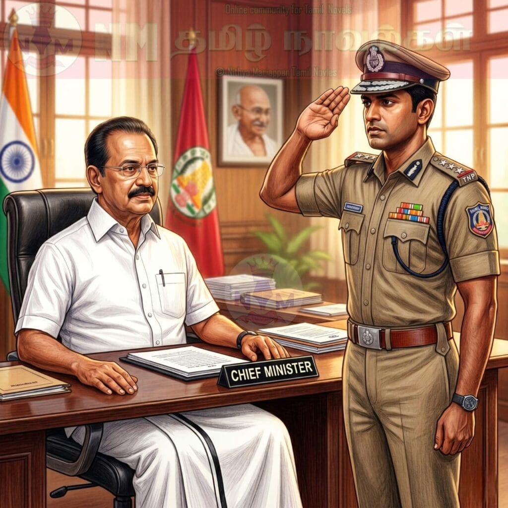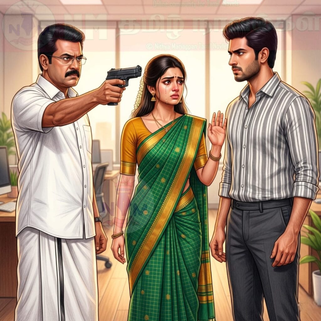 அருள்மொழி அமைதியாய் இருக்கவும் அவன் பக்கம் குனிந்தவர் “என் பொண்டாட்டி சொன்னாளேனு இரக்கம் பாத்து உன்னை லண்டனுக்கு அனுப்பி வச்சது எவ்ளோ பெரிய தப்பு. உன்னை ஹாஸ்பிட்டல்ல வச்சே முடிச்சிருக்கணும். சனியன் இவனுக்கு ஞாபகமா வரப்போகுதுனு கொஞ்சம் அலட்சியமா இருந்துட்டேன். அந்த அலட்சியத்துக்கு விலை, நீ என் குடும்பத்துலயும் கட்சியிலயும் நுழைஞ்சிட்ட. அப்பா, அம்மானு யாருமே இல்லாம நீ மட்டும் ஏன் இங்க வாழணும்? சுந்தரமூர்த்தி கூட சேர்ந்து சொர்க்கத்தை அனுபவி” என்றபடி வேகமாய் இடுப்பில் சொருகியிருந்த துப்பாக்கியை எடுத்து அவனைக் குறிவைக்கப் பார்க்கச் சரியாக அந்நேரத்தில் ஓடோடி வந்தாள் வானதி.