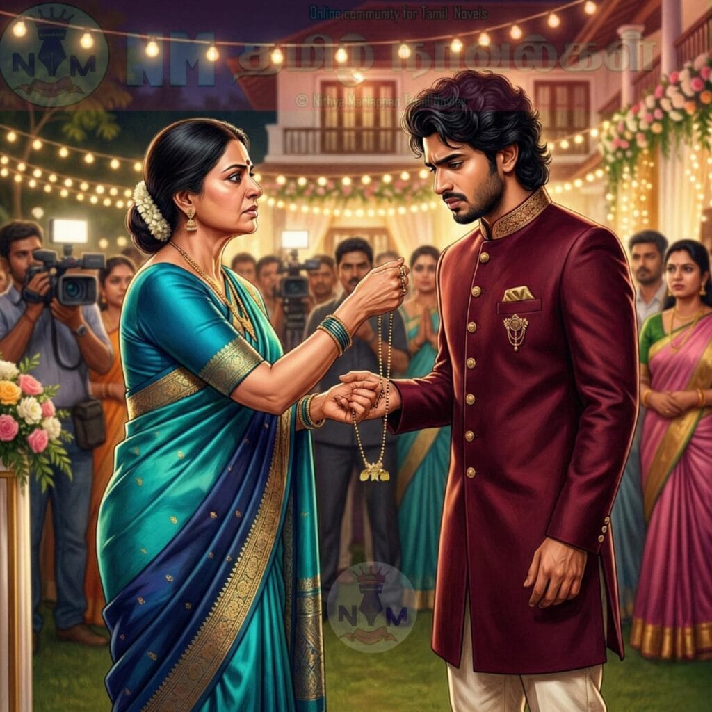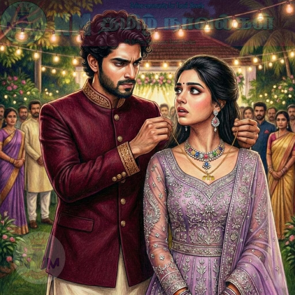 அதில் அவள் தடுமாறி விழப்போக, வேண்டாவெறுப்பாகக் கையைப் பிடித்து நிறுத்தியவன், தனது பாட்டியின் மாங்கல்யம் கோர்த்த முத்துமாலையை கடுஞ்சினத்தோடு அவளது கழுத்தில் போட்டுவிட்டான்.