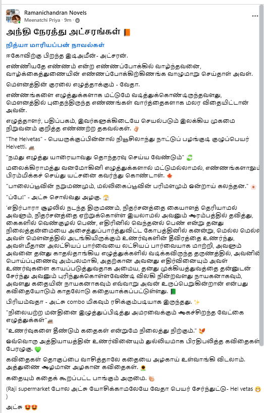 - கதை பதிவுகளை உடனுக்குடன் அறிய நித்யா மாரியப்பனின் வாட்சப் சேனல், முகநூல் குழுவில் இணைந்துகொள்ளுங்கள். அவற்றின் இணைப்பு மேலே கொடுக்கப்பட்டுள்ளது. அன்றன்றைய பதிவுகளை உங்கள் மின்னஞ்சலில் பெற்ற நியூஸ் லெட்டரை சப்ஸ்கிரைப் செய்து கொள்ளுங்கள்!