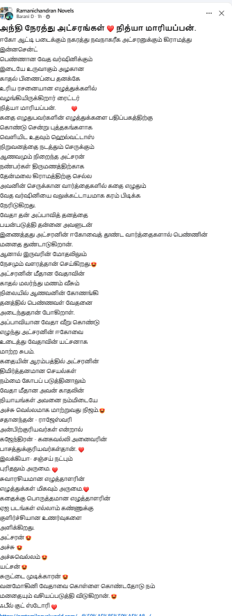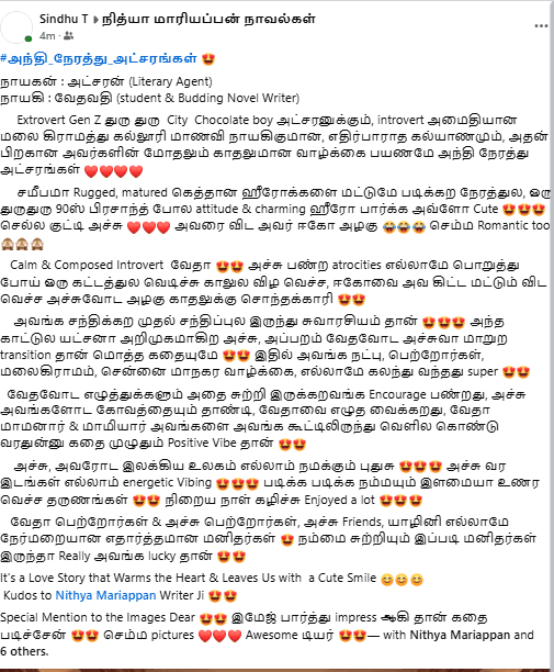 அச்சு, அவரோட இலக்கிய உலகம் எல்லாம் நமக்கும் புதுசு 😍😍😍 அச்சு வர இடங்கள் எல்லாம் energetic Vibing 😍😍😍 படிக்க படிக்க நம்மயும் இளமையா உணர வெச்ச தருணங்கள் 😍😍 நிறைய நாள் கழிச்சு Enjoyed a lot 😍😍😍