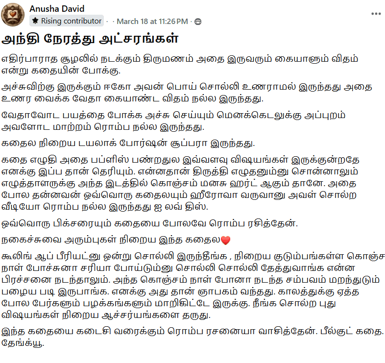 Extrovert Gen Z துரு துரு City Chocolate boy அட்சரனுக்கும், introvert அமைதியான மலை கிராமத்து கல்லூரி மாணவி நாயகிகுமான, எதிர்பாராத கல்யாணமும், அதன் பிறகான அவர்களின் மோதலும் காதலுமான வாழ்க்கை பயணமே அந்தி நேரத்து அட்சரங்கள் ❤️❤️❤️❤️