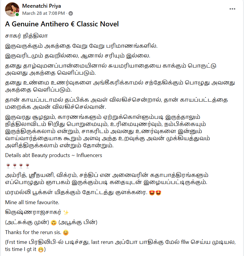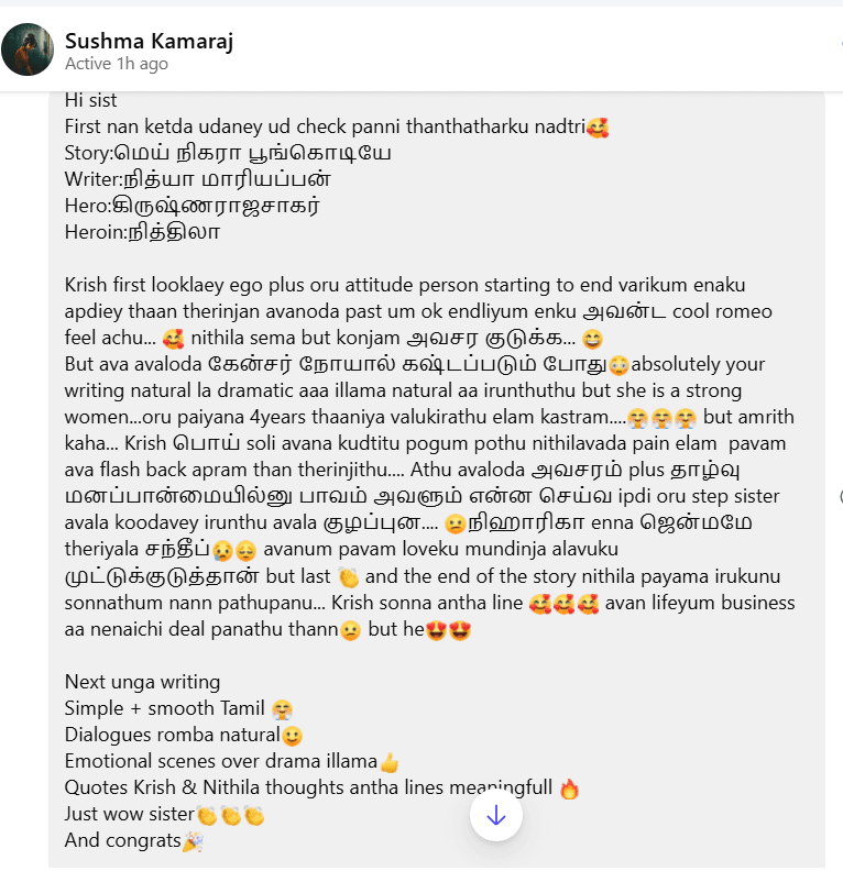 - கதை பதிவுகளை உடனுக்குடன் அறிய நித்யா மாரியப்பனின் வாட்சப் சேனல், முகநூல் குழுவில் இணைந்துகொள்ளுங்கள். அவற்றின் இணைப்பு மேலே கொடுக்கப்பட்டுள்ளது. அன்றன்றைய பதிவுகளை உங்கள் மின்னஞ்சலில் பெற்ற நியூஸ் லெட்டரை சப்ஸ்கிரைப் செய்து கொள்ளுங்கள்!