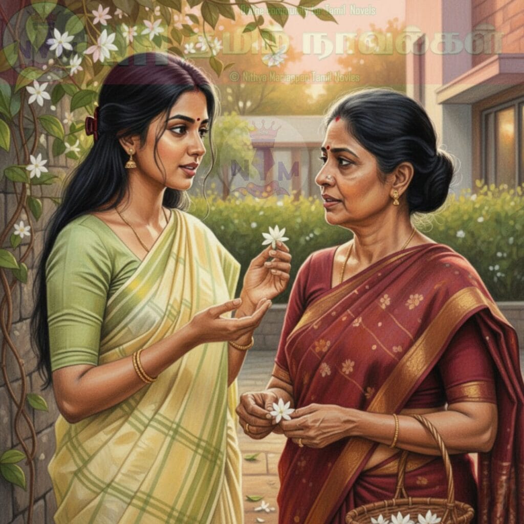 சிவகாமியும் மலர்விழியும் தோட்டத்திலிருந்து பூ பறித்துக்கொண்டிருந்தார்கள். வெகு நேரம் சிவகாமி மொபைலில் எழிலரசியுடன் பேசிக்கொண்டிருந்ததைக் கவனித்த மலர்விழி என்ன விவகாரமென அவரே சொல்லட்டுமெனக் காத்திருந்தாள்.